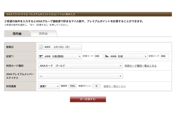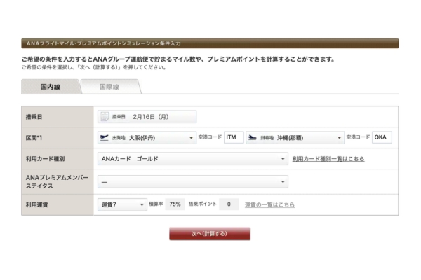 ANA SUPER VALUE 75で、ANAゴールドカードでシミュレーション。