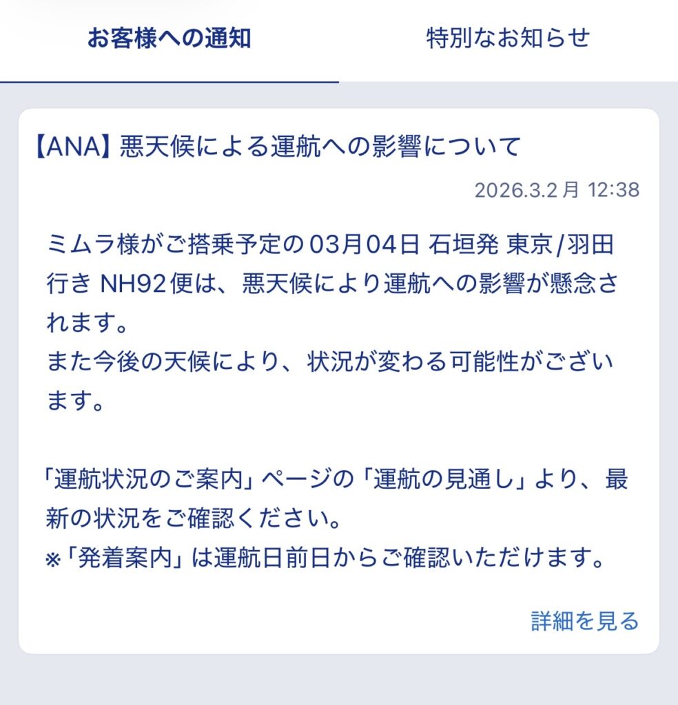 羽田発着のお知らせは解除されていました。